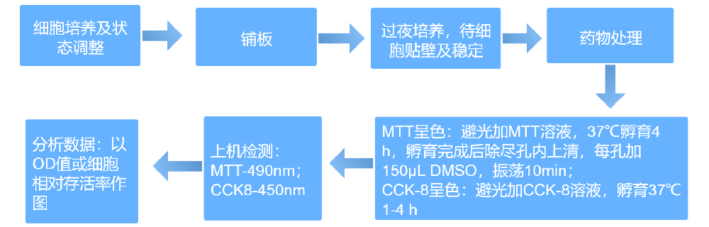 活细胞线粒体中的琥珀酸脱氢酶能使外源性MTT还原为水不溶性的蓝紫色结晶甲瓒(Formazan)并沉积在细胞中,而死细胞无此功能。二甲基亚砜(DMSO)能溶解细胞中的甲瓒,用酶标仪在490nm波长处测定其光吸收值,在一定细胞数范围内,MTT结晶形成的量与细胞数成正比。根据测得的吸光度值(OD值),来判断活细胞数量,OD值越大,细胞活性越强(如果是测药物毒性,则表示药物毒性越小)。